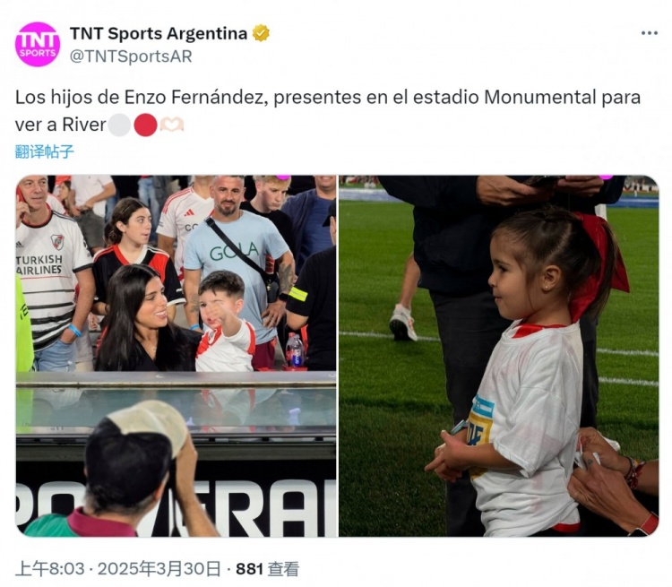 瓦倫蒂娜帶著孩子們來到紀(jì)念碑球場,現(xiàn)場觀看河床隊的比賽。恩佐出身于河床青訓(xùn),他與瓦倫蒂娜去年曾分手,兩人今年1月份宣布復(fù)合。