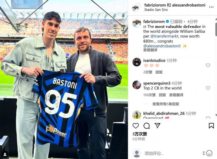 羅馬諾社媒曬與巴斯托尼合影:8000萬歐,世界身價(jià)并列最高后衛(wèi)