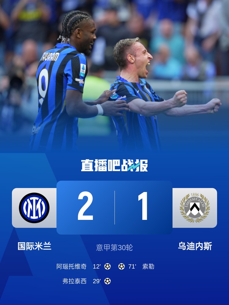 意甲第30輪,國際米蘭2-1烏迪內(nèi)斯,阿瑙托維奇、弗拉泰西破門,索默神撲。