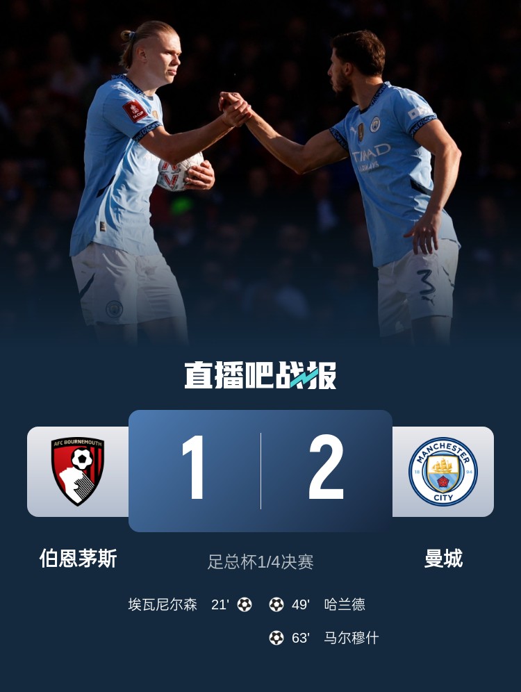 足總杯1/4決賽,曼城2-1逆轉(zhuǎn)伯恩茅斯,哈蘭德破門+傷退,奧賴?yán)?助攻。