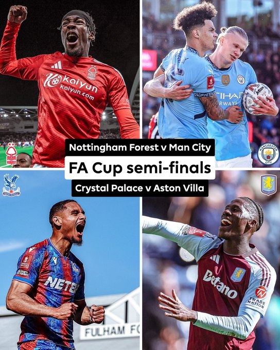至此,足總杯4強對陣出爐:曼城vs諾丁漢森林,水晶宮vs維拉。