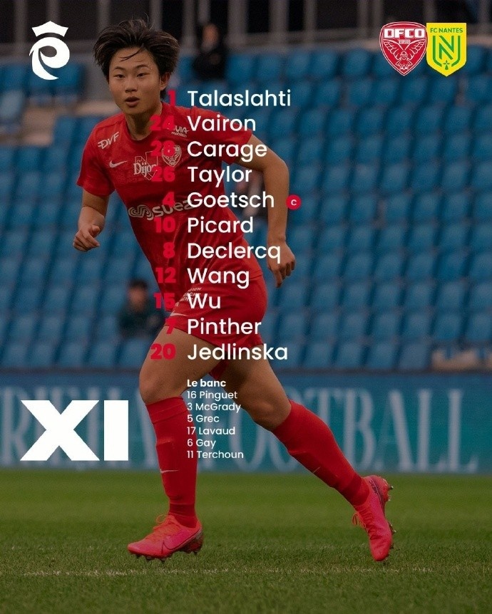 法甲第19輪第戎女足主場3-0戰(zhàn)勝南特女足,吳澄舒、王妍雯首發(fā)出場,第17分鐘,吳澄舒接隊友左路傳中,頭球破門,首開紀(jì)錄,連續(xù)兩場有進(jìn)球入賬。上輪聯(lián)賽第戎客場2-0戰(zhàn)勝勒阿弗爾女足,吳澄舒也斬獲一粒進(jìn)球。王妍雯打滿90分鐘,傷停補時階段被隊友換下。