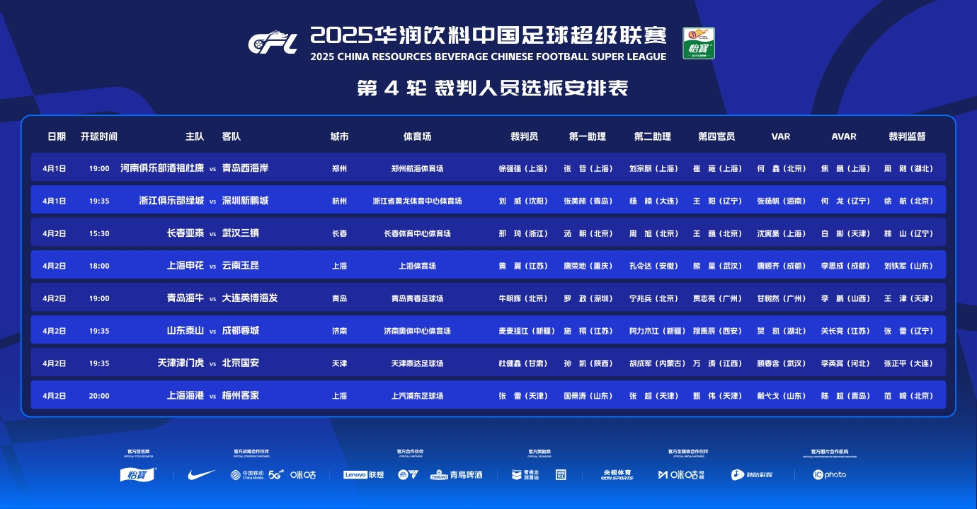 04月01日訊 中足聯(lián)公布2025賽季中超第4輪裁判選派安排,麥麥提江主哨泰山vs蓉城,馬寧本輪比賽無執(zhí)法任務(wù)。