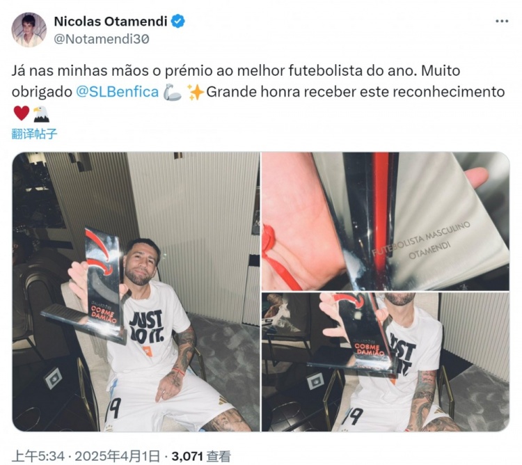 37歲奧塔門迪當(dāng)選本菲卡年度最佳球員,社媒曬手拿獎杯照片