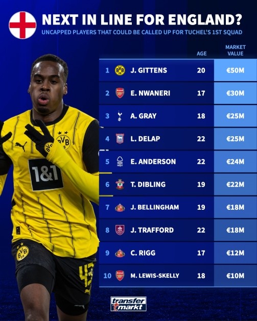 2月25日訊 英格蘭將在下月的世預(yù)賽中對(duì)陣阿爾巴尼亞以及拉脫維亞,圖赫爾也將公布執(zhí)教英格蘭的首期名單,德轉(zhuǎn)列出了10名未代表英格蘭成年隊(duì)出戰(zhàn)過(guò),但本次可能入選圖赫爾首期名單的球員,吉滕斯、恩瓦內(nèi)里、斯凱利、喬布-貝林厄姆等人在列。