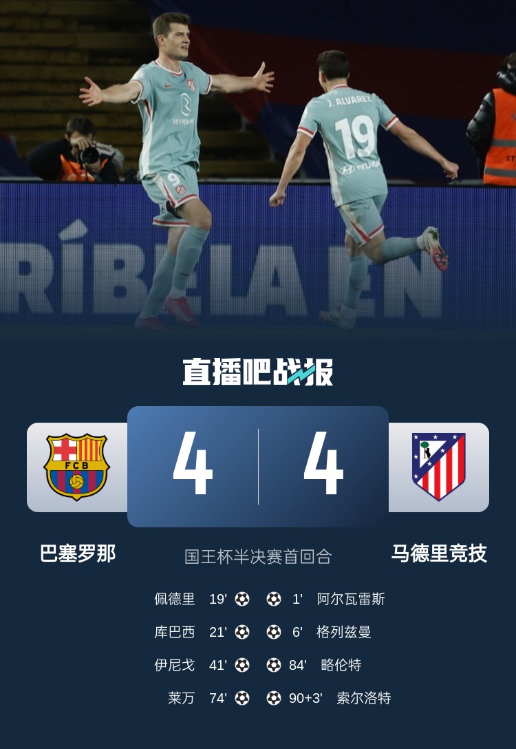 國王杯半決賽首回合,巴薩4-4遭馬競絕平,本場雙方上演進球大戰(zhàn)!