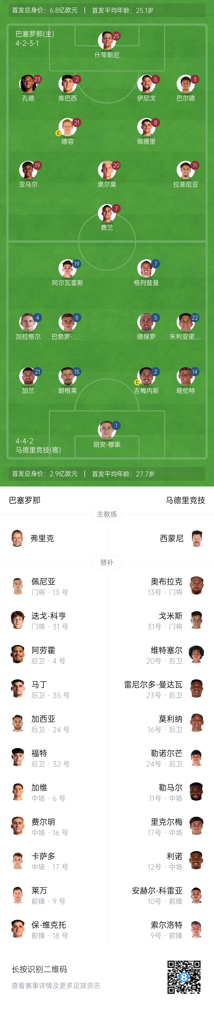 巴薩首發(fā):25-什琴斯尼、2-庫巴西、3-巴爾德、5-伊尼戈-馬丁內(nèi)斯、23-孔德、8-佩德里、20-奧爾莫、21-德容、7-費蘭-托雷斯、11-拉菲尼亞、19-亞馬爾