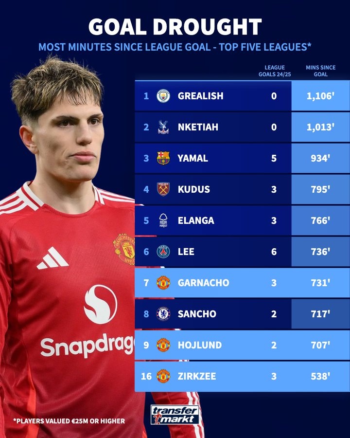 2月26日訊 德國轉(zhuǎn)會(huì)市場統(tǒng)計(jì)了目前五大聯(lián)賽的進(jìn)球荒時(shí)間排名,曼聯(lián)有2名球員進(jìn)入前十。