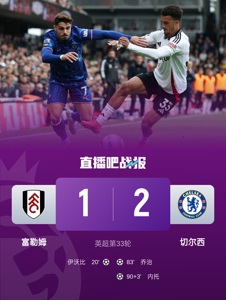 切爾西2-1絕殺富勒姆,喬治破門(mén),內(nèi)托第93分鐘絕殺。