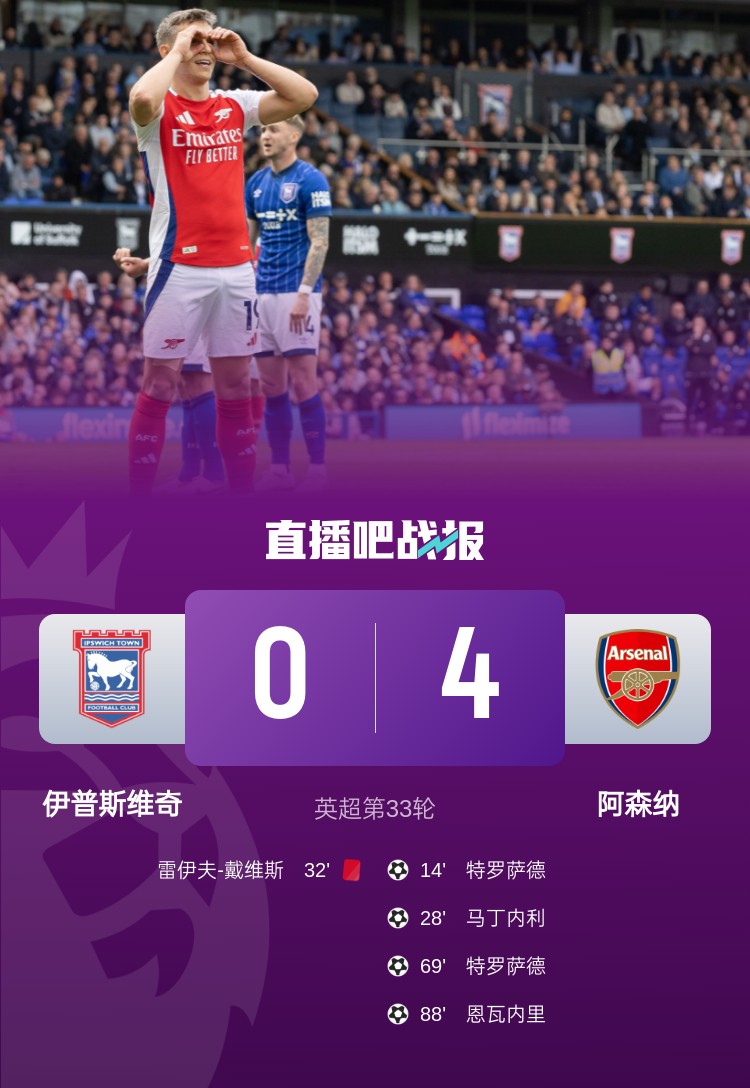 阿森納4-0橫掃伊普斯維奇,槍手方面特羅薩德雙響,馬丁內(nèi)利、恩瓦內(nèi)里破門(mén)。