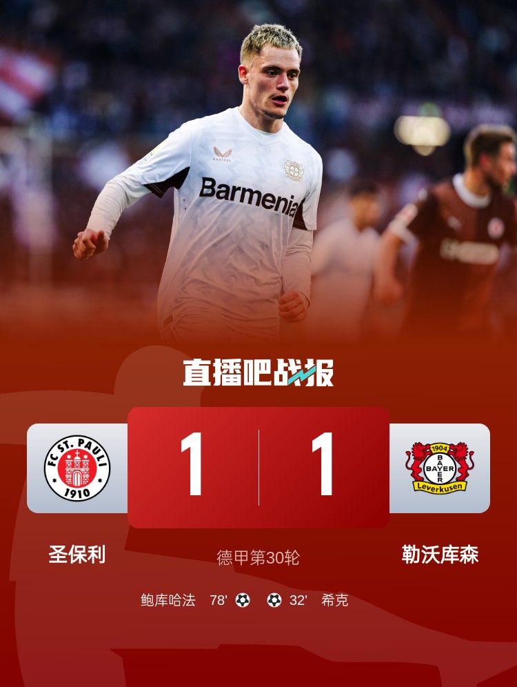 德甲-勒沃庫(kù)森1-1圣保利距榜首8分 ??祟^球破門(mén)格里馬爾多獻(xiàn)助攻
