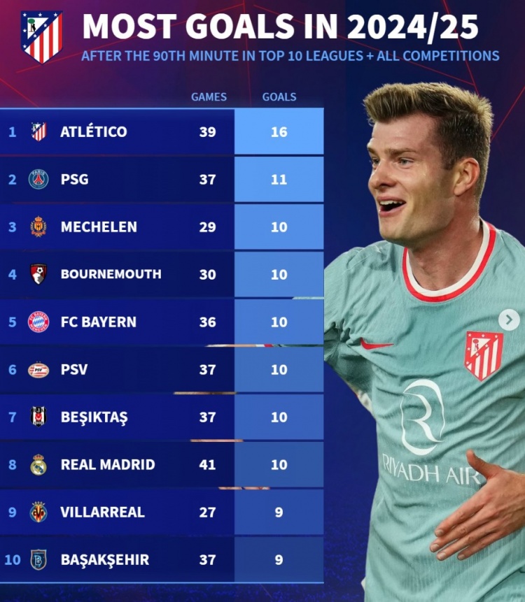 本賽季歐足聯(lián)排名前十聯(lián)賽球隊(duì)各項(xiàng)賽事90分鐘后進(jìn)球榜: