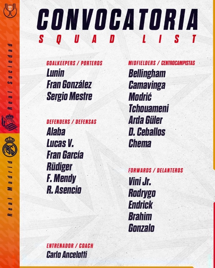 2月26日訊 北京時間2月27日凌晨4:30,國王杯半決賽首回合,皇馬將客戰(zhàn)皇家社會。賽前,皇馬官方公布了本場比賽球隊大名單,庫爾圖瓦和姆巴佩缺席。