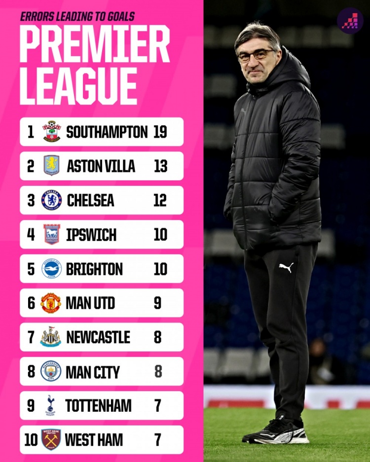 南安普頓本賽季因失誤丟掉19球英超最多,比第二名維拉多出6球