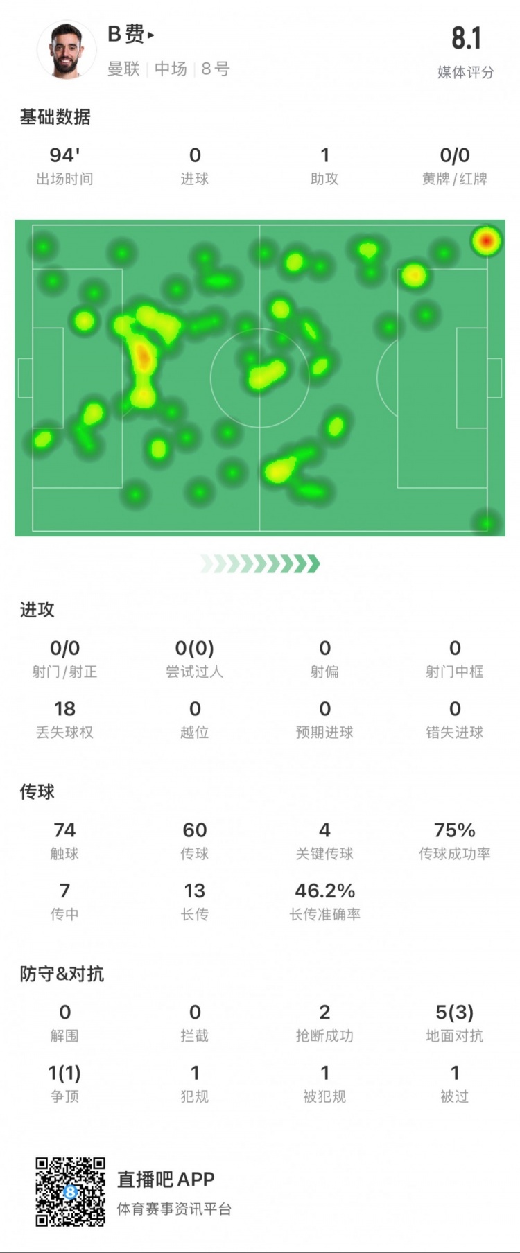B費(fèi)本場(chǎng)數(shù)據(jù):1次助攻,4次關(guān)鍵傳球,14次長(zhǎng)傳成功7次