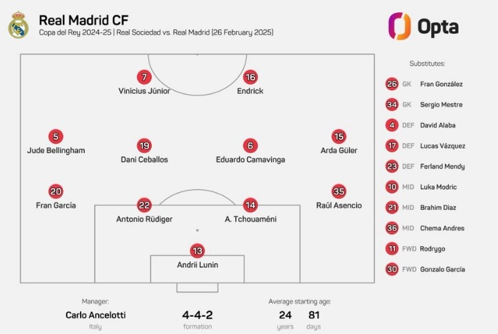 皇馬變陣,居勒爾、恩德里克、維尼修斯首次搭檔先發(fā)出戰(zhàn)