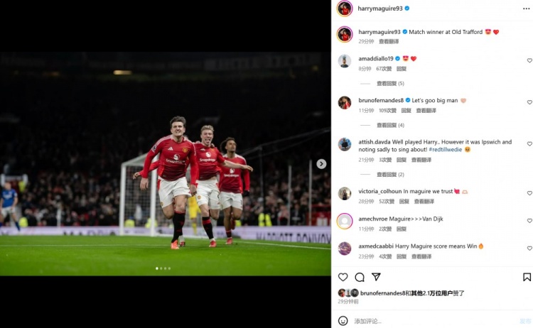 在下半場曼聯(lián)10人作戰(zhàn)的不利局面下,馬奎爾打進(jìn)關(guān)鍵進(jìn)球。賽后馬奎爾也在個人社媒曬出本場慶祝照,配文寫道:“在老特拉福德球場打進(jìn)制勝進(jìn)球!”