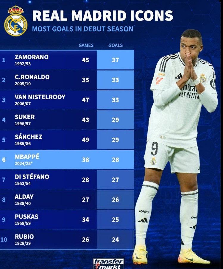 2月27日訊 姆巴佩在皇馬效力的首個(gè)賽季目前各項(xiàng)賽事已經(jīng)打進(jìn)28球,距離皇馬隊(duì)史首秀賽季進(jìn)球數(shù)紀(jì)錄還有9球,以下為具體榜單: