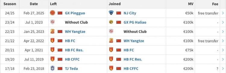 在胡人天的個人頁面顯示,他已經(jīng)于2月27日以自由身加盟南京城市,合同年限暫未披露。