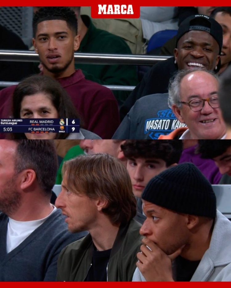 國王杯取勝后,姆巴佩&貝林&維尼修斯等現(xiàn)場觀看歐冠男籃國家德比