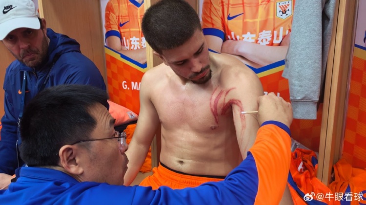 記者牛志明賽后曬出卡扎爾在休息室處理傷情的照片,卡扎爾左側(cè)的肩胛及上臂處有多條血痕,球隊的工作人員正在為他擦拭傷處。