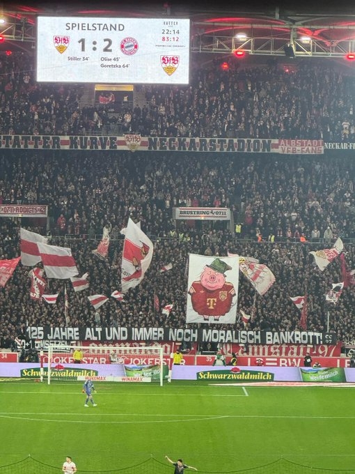 3月1日訊 今天凌晨,拜仁在德甲客場(chǎng)3-1擊敗斯圖加特,比賽期間,斯圖加特球迷展示橫幅嘲諷拜仁。