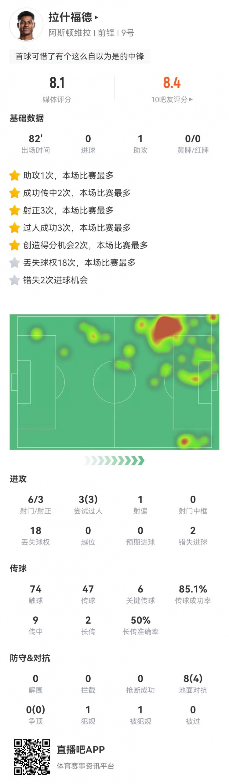 3月1日訊 維拉在本輪足總杯2-0擊敗卡迪夫城,拉什福德本場(chǎng)數(shù)據(jù)如下: