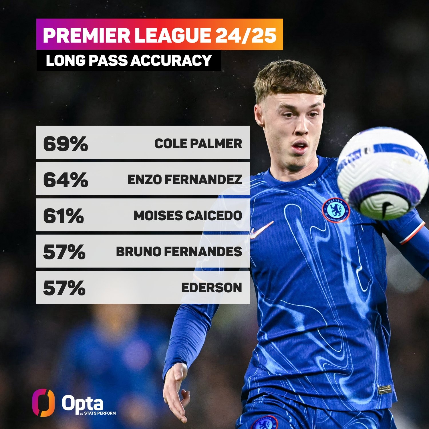 3月1日訊 根據(jù)OPTA統(tǒng)計,帕爾默是本賽季英超長傳成功率最高的球員。