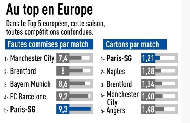 隊報統(tǒng)計:本賽季至今,巴黎場均犯規(guī)和吃牌數(shù)均排五大聯(lián)賽前五少