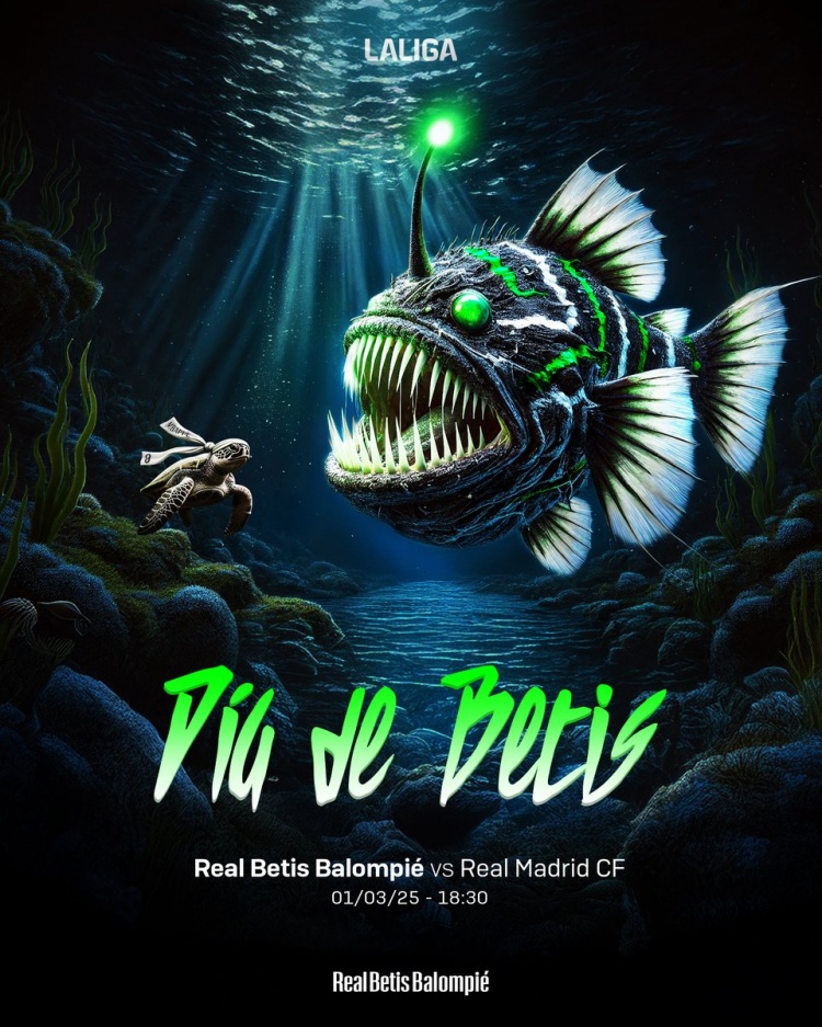 貝蒂斯社媒發(fā)布海報(bào)為此役預(yù)熱,海報(bào)中有一只綠黑白三色條紋、散發(fā)綠光的燈籠魚以及一只印有姆巴佩名字和9號(hào)的海龜。