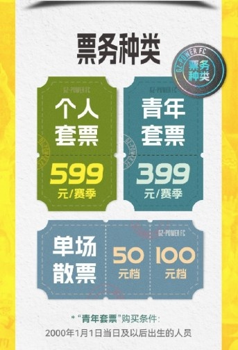 其中,個人套票599元/賽季,青年套票399元/賽季(2000年1月1日及以后出生),單場散票有50元和100元檔。