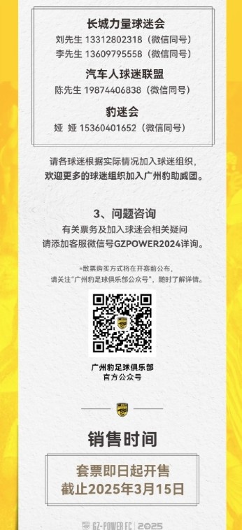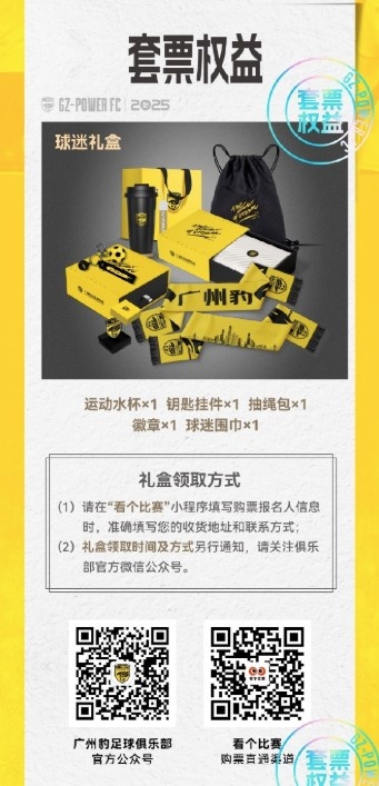 3月1日訊 中甲球隊廣州豹公布2025賽季主場票務(wù)銷售公告,有個人套票、青年套票、單場散票等種類。