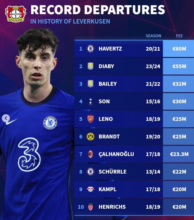 3月2日訊 《轉(zhuǎn)會(huì)市場(chǎng)》統(tǒng)計(jì)了勒沃庫森隊(duì)史賣人最貴榜,哈弗茨以8000萬歐元居首。