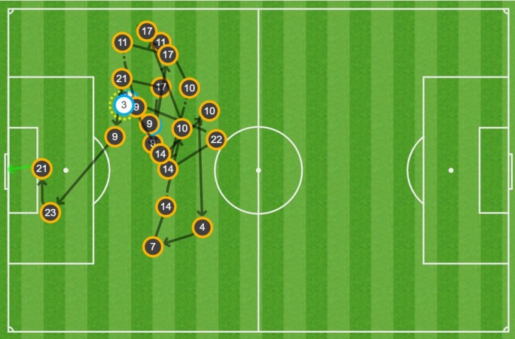 據(jù)統(tǒng)計,這粒進球經過了皇馬球員19次連續(xù)傳球后打進。在皇馬本賽季西甲所有客場進球中,這是皇馬進球前傳遞次數(shù)最多的一粒進球。