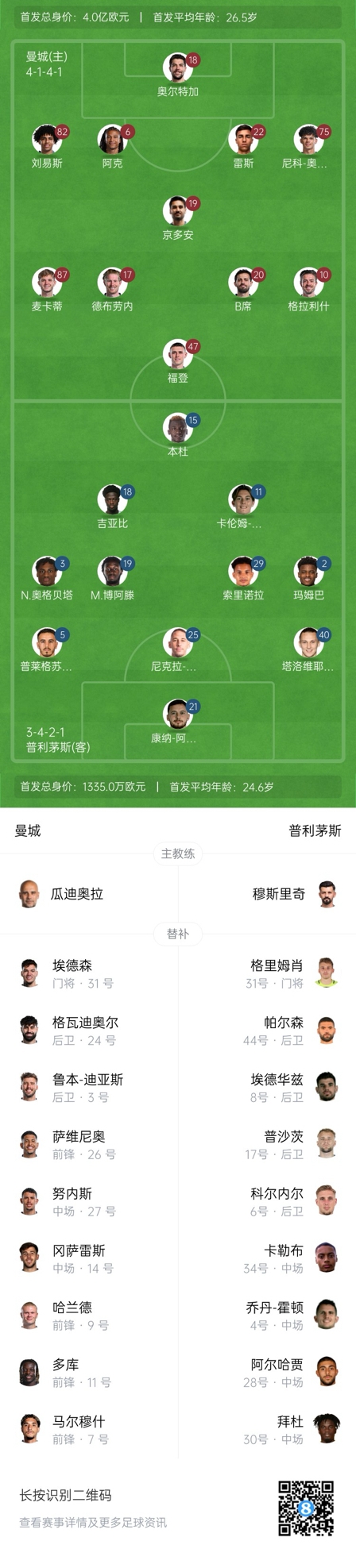 曼城首發(fā):18-奧爾特加、82-劉易斯、22-雷斯、6-阿克、75-奧賴(lài)?yán)?9-京多安、17-德布勞內(nèi)、87-麥卡蒂、20-B-席爾瓦、10-格拉利什、47-福登