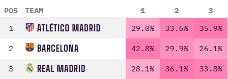 皇馬最新西甲奪冠概率28.1%,西甲三強(qiáng)中最低