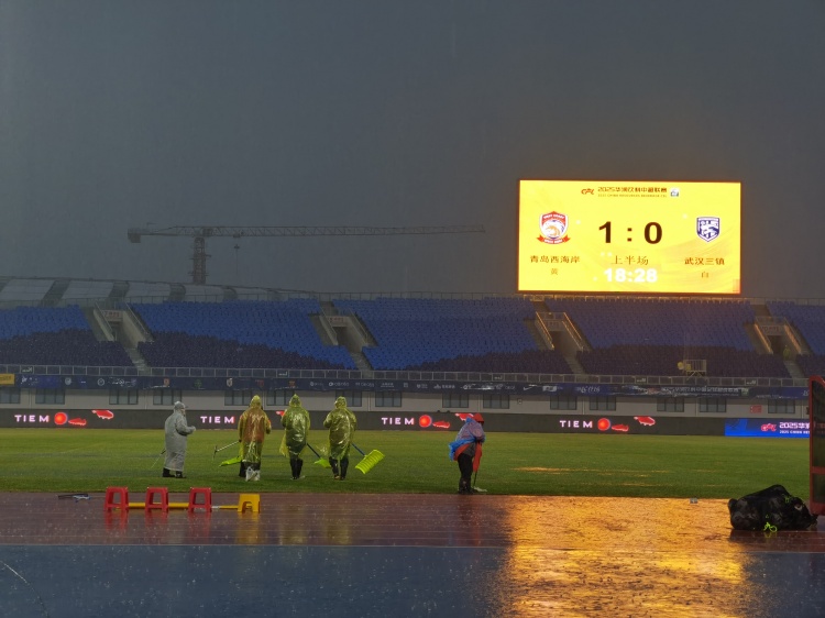 本場比賽原定在今日15:30進行,后又因大雨推遲15分鐘開球,在比賽進行到第18分鐘時,主裁吹停比賽,隨后現(xiàn)場廣播播報,本場比賽將延期進行,場上比分暫為西海岸1-0三鎮(zhèn)。