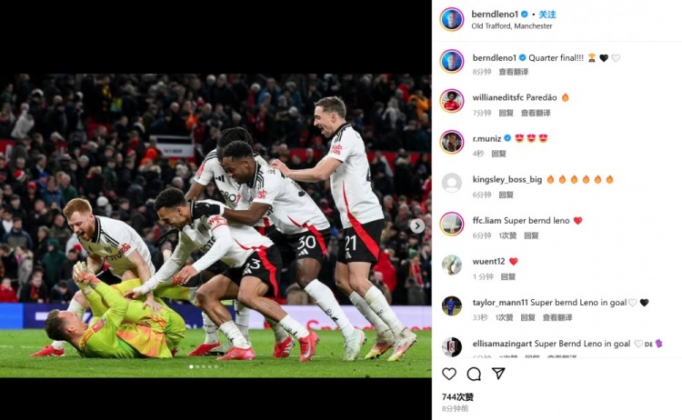 萊諾也在賽后通過(guò)社媒曬出自己被隊(duì)友們簇?fù)淼膽c祝照,并配文:“晉級(jí)八強(qiáng)戰(zhàn)!”