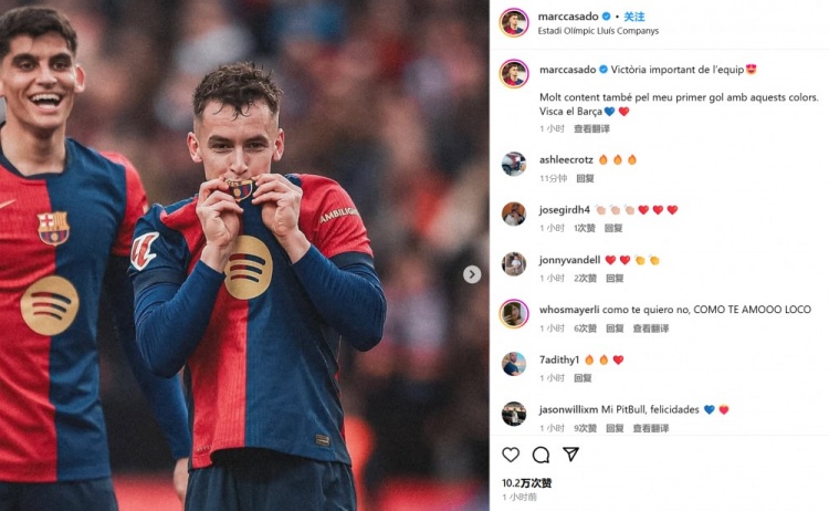 卡薩多也通過(guò)社媒曬出自己親吻隊(duì)徽的照片,并配文:“球隊(duì)拿下重要的勝利!我非常高興能夠打進(jìn)巴薩生涯處子球,巴薩萬(wàn)歲!”