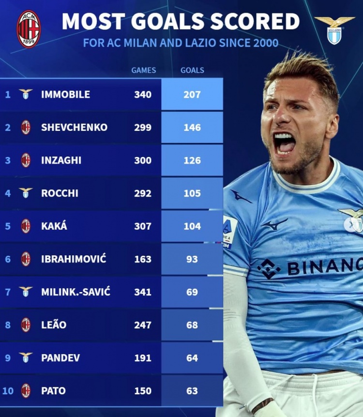 米蘭&拉齊奧新世紀(jì)射手榜: