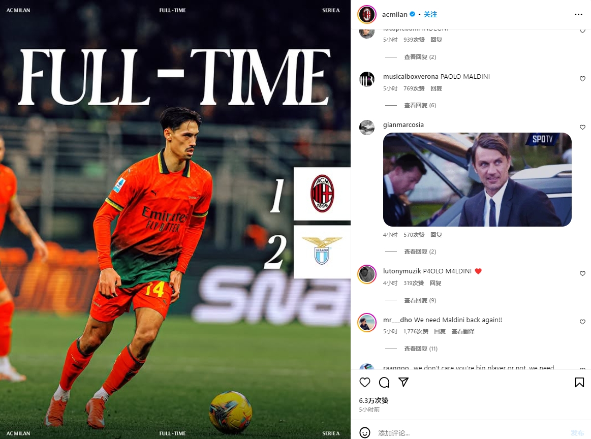 賽后米蘭官方INS評論區(qū),不少球迷呼吁馬爾蒂尼回歸: