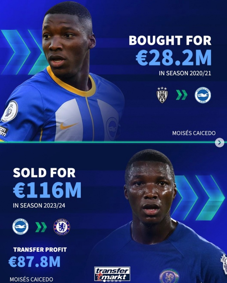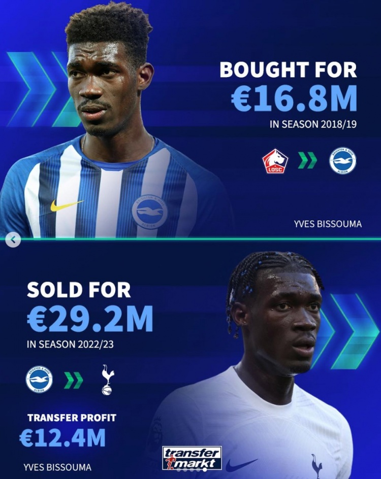 3月3日訊 《轉會市場》統(tǒng)計了布萊頓近年的5筆低買高賣轉會操作,共計凈賺超過2億歐元。