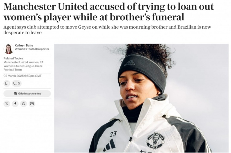 巴西女足球員蓋斯在2023年以創(chuàng)紀(jì)錄的轉(zhuǎn)會(huì)費(fèi)從巴塞羅那轉(zhuǎn)會(huì)曼聯(lián),但現(xiàn)在,她在俱樂(lè)部過(guò)得并不開心,想要離開。蓋斯的經(jīng)紀(jì)人路易斯-費(fèi)利佩-席爾瓦告訴《電訊報(bào)》,球員在一月份回巴西參加去世哥哥的葬禮時(shí),曼聯(lián)曾試圖將她租借到美國(guó)的俱樂(lè)部。
