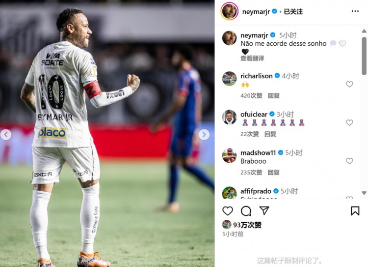 加盟桑托斯7場3球3助,內(nèi)馬爾社媒曬照:別把我從夢中叫醒