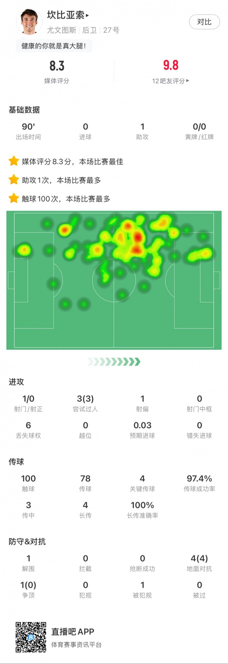坎比亞索本場(chǎng)數(shù)據(jù):1次助攻,4次關(guān)鍵傳球,3次成功過(guò)人