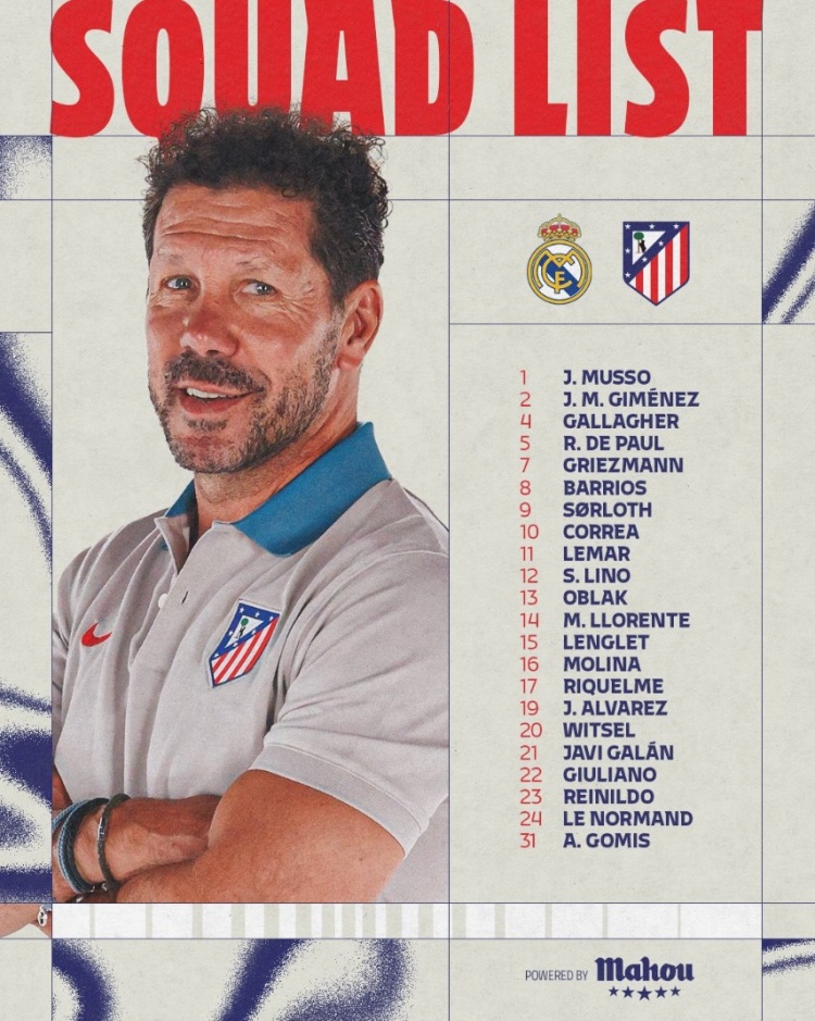 前鋒:7-格列茲曼、9-索爾洛特、10-科雷亞、19-阿爾瓦雷斯、22-朱利亞諾-西蒙尼
