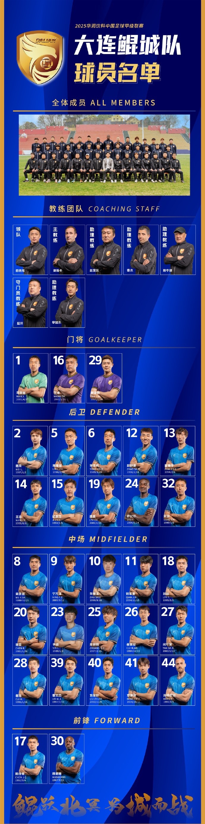 2025華潤(rùn)飲料中國(guó)足球甲級(jí)聯(lián)賽大連鯤城球員名單出爐! ??