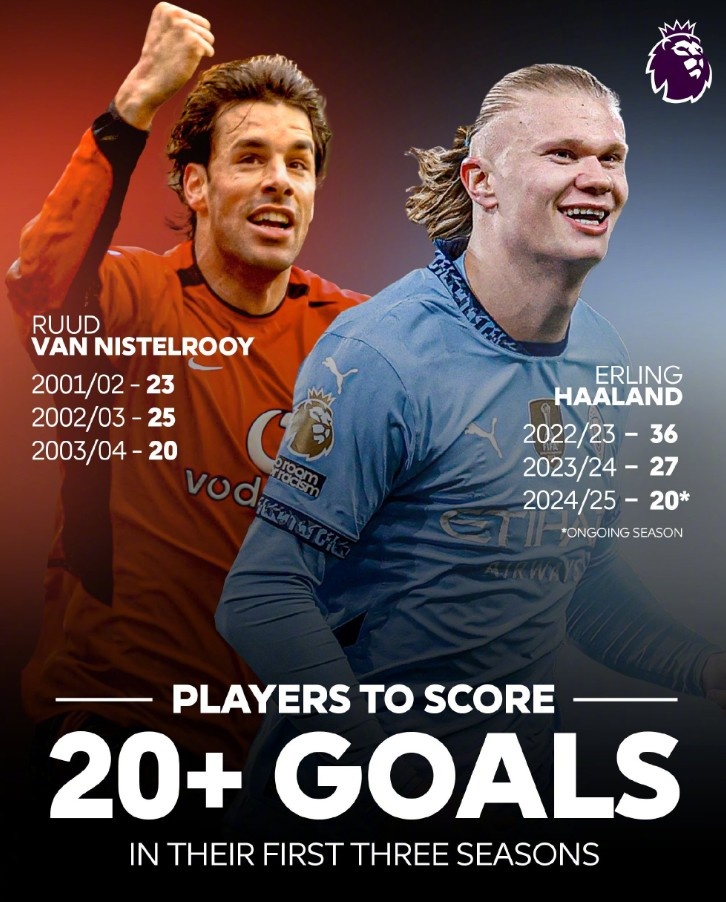 英超歷史只有兩名球員生涯前三賽季進球20+:分別是范尼和哈蘭德