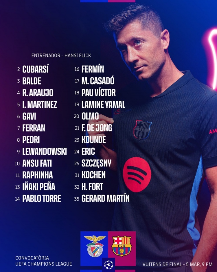 3月4日訊 北京時(shí)間本月6日凌晨4時(shí),歐冠1/8決賽首回合巴薩將客戰(zhàn)本菲卡,巴薩今日公布此役大名單。