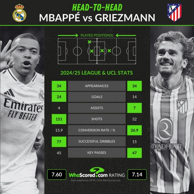 3月5日訊 歐冠十六強戰(zhàn)將上演馬德里同城德比,whoscored也對比了姆巴佩和格列茲曼本賽季的關(guān)鍵數(shù)據(jù)。